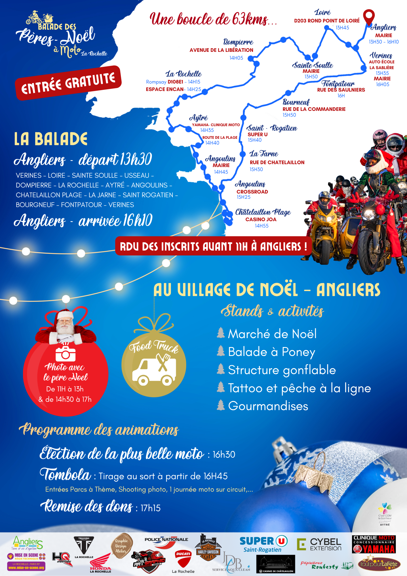 A spectacular procession of decorated motorcycles, piloted by Santa Clauses, will cover a 63 km loop from Angliers (departure at 1:30pm), before arriving on the seafront of Châtelaillon-Plage.